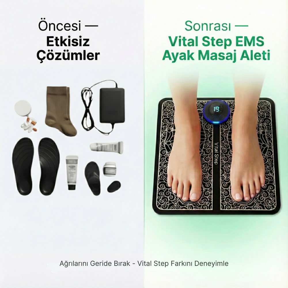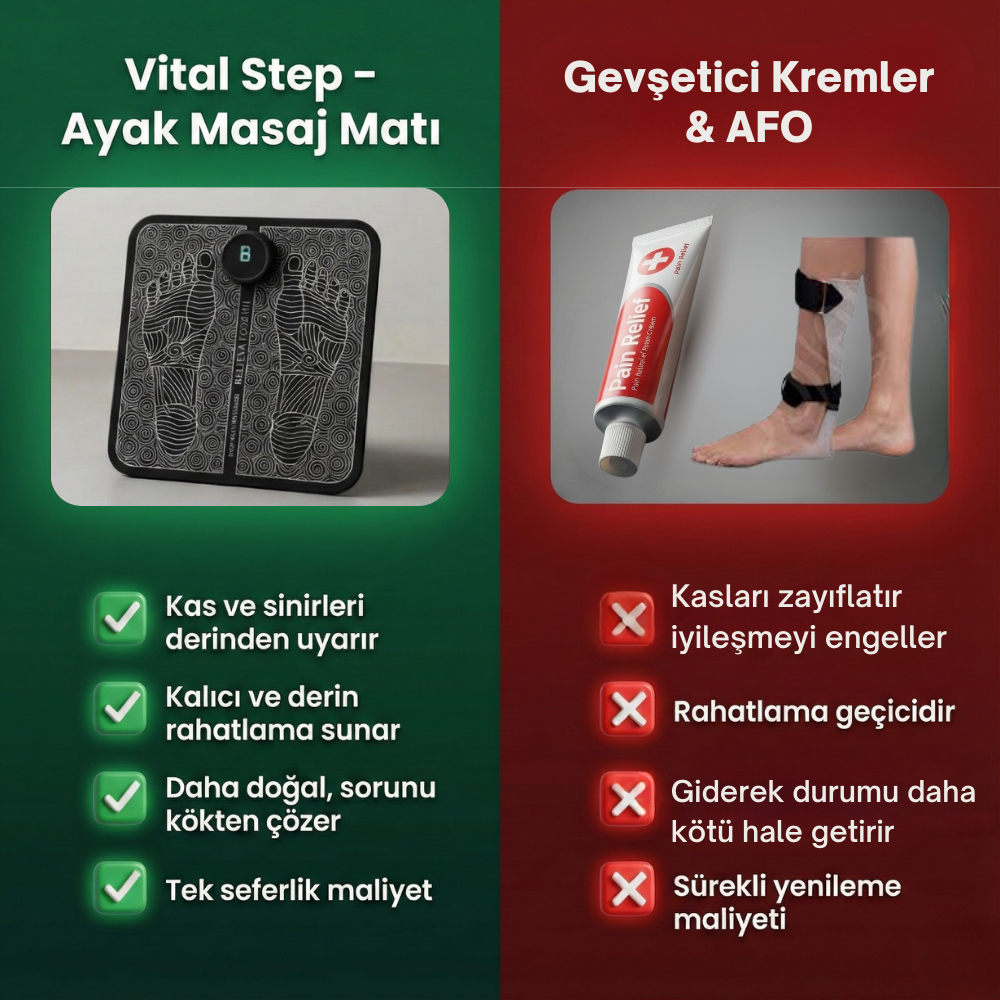 Kremler, çoraplar, haplar ve klasik masaj aletleri yüzeysel rahatlama sağlar, ancak sinir aktivitesini yeniden uyandırmaz ve dolaşımı kalıcı şekilde desteklemez. Etkileri kısa sürede azalır, ağrı ve yanma hissi tekrar geri döner. Vital Step nazik elektrik akımlarıyla kasları harakete geçirir, kan akışını düzene sokar ve masaj yaparak günün her anından keyif almanızı sağlar